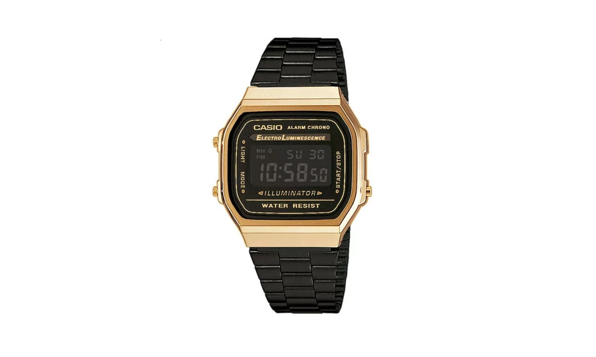 Avec un look vintage très sobre, la montre Casio saura vous plaire. La Montre Casio, Vintage, A168WEGB-1BEF, se compose d'un cadran rectangulaire LCD doré avec motifs losanges, d'un boitier en résine doré et d'un bracelet en acier noir.
