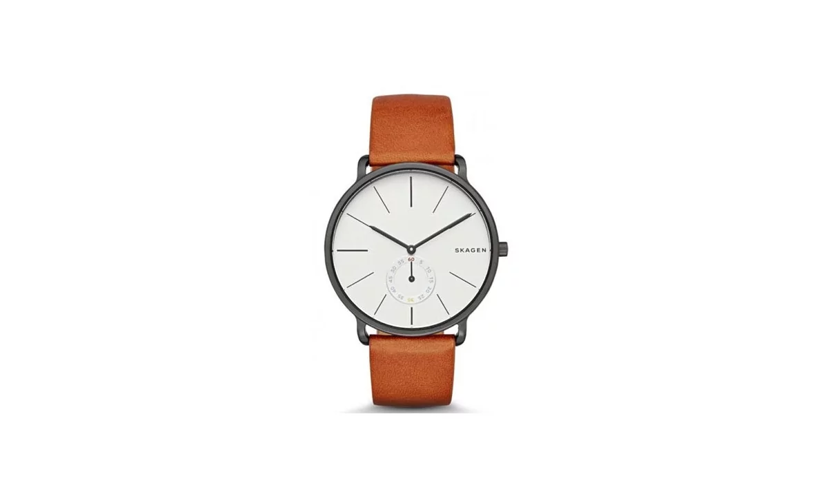 La montre Skagen, Hagen est composée d'un cadran rond blanc, d'un tour de cadran noir et d'un bracelet en cuir marron.